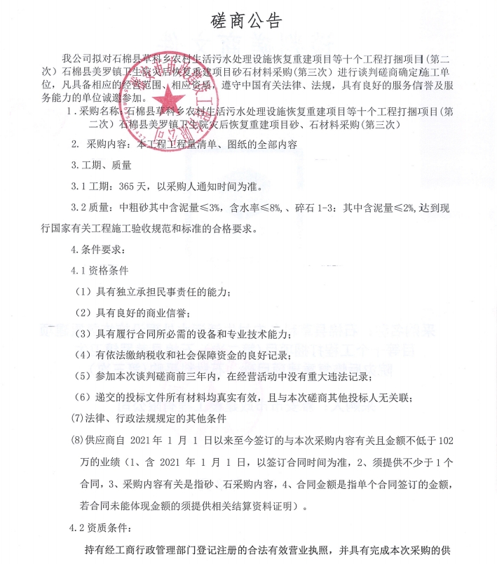 石棉縣草科鄉(xiāng)農(nóng)村生活污水處理設(shè)施恢復(fù)重建項目等十個工程打捆項目(第二次)、石棉縣美羅鎮(zhèn)衛(wèi)生院災(zāi)后恢復(fù)重建項目砂石材料采購(第三次)磋商公告