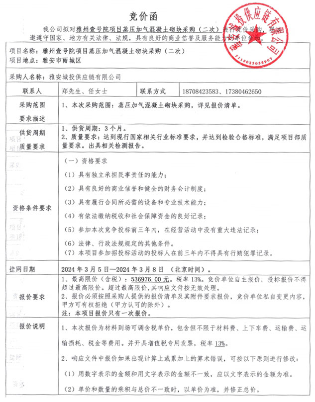 雅州壹號院項目蒸壓加氣混凝土砌塊采購(第二次)競價公告