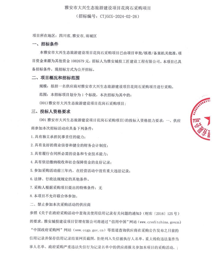雅安市大興生態(tài)旅游建設(shè)項(xiàng)目花崗石采購項(xiàng)目公告