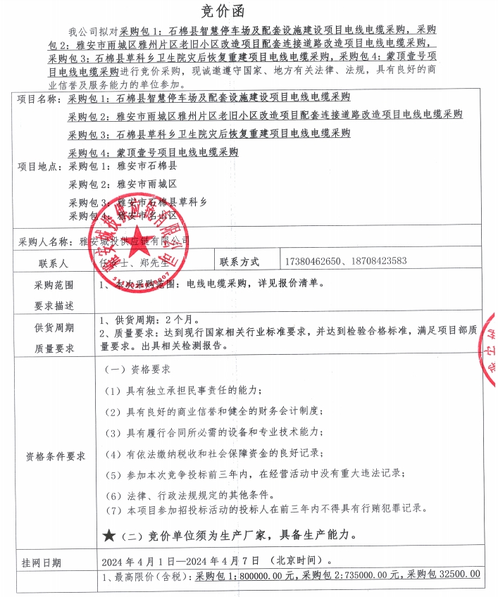 雅安城投供應(yīng)鏈有限公司電線電纜采購(gòu)競(jìng)價(jià)公告