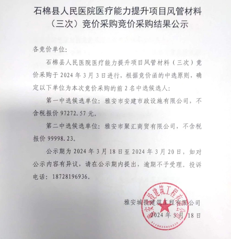 石棉縣人民醫(yī)院醫(yī)療能力提升項(xiàng)目風(fēng)管材料(三次)競價(jià)采購競價(jià)采購結(jié)果公示