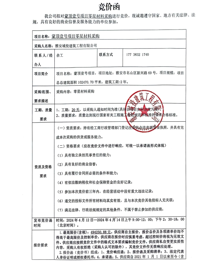 蒙頂壹號(hào)項(xiàng)目零星材料采購(gòu)競(jìng)價(jià)公告