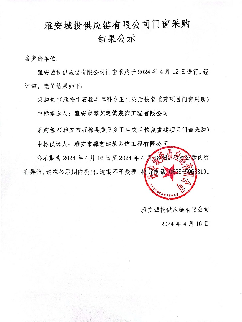 雅安城投供應鏈有限公司門窗采購結果公示