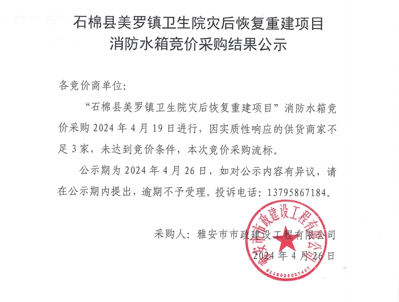 石棉縣美羅鎮(zhèn)衛(wèi)生院災(zāi)后恢復(fù)重建項目消防水箱材料競價采購結(jié)果公示