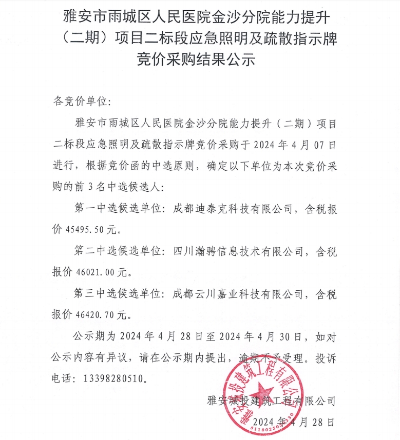 雅安市雨城區(qū)人民醫(yī)院金沙分院能力提升(二期)項(xiàng)目二標(biāo)段應(yīng)急照明及疏散指示牌競價(jià)采購結(jié)果公示