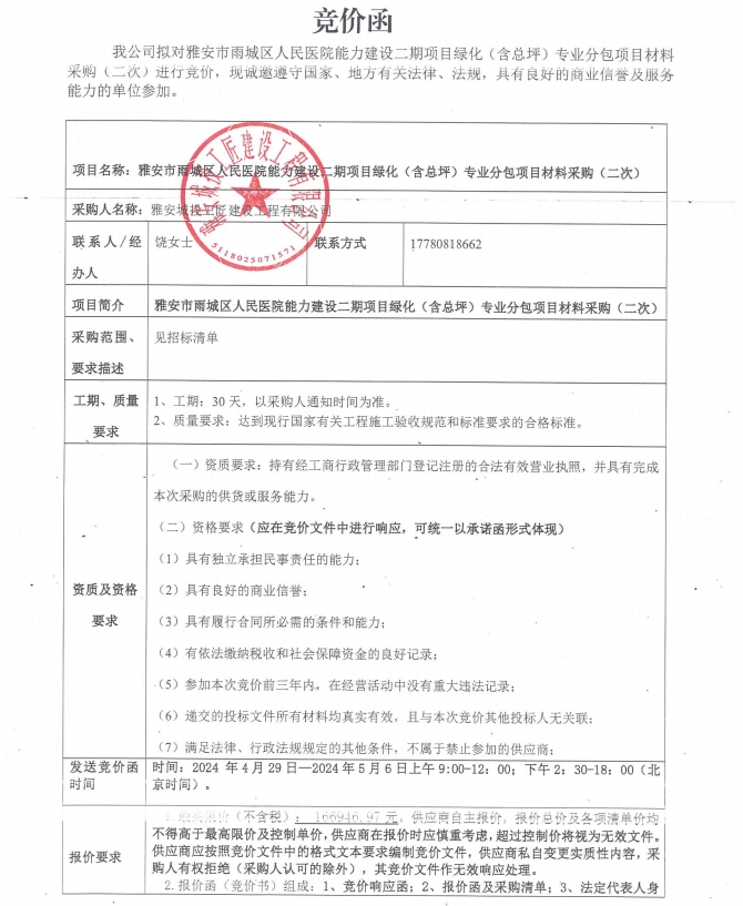 競(jìng)價(jià)函-雅安市雨城區(qū)人民醫(yī)院能力建設(shè)二期項(xiàng)目綠化(含總坪)專業(yè)分包項(xiàng)目材料采購(gòu)(二次)