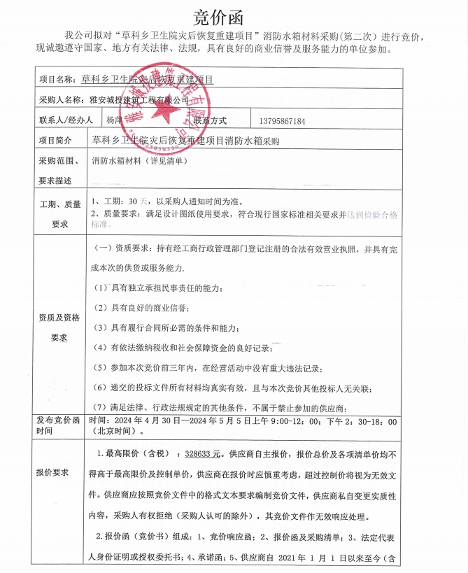草科鄉(xiāng)衛(wèi)生院災(zāi)后恢復(fù)重建項(xiàng)目消防水箱采購(gòu)(第二次)競(jìng)價(jià)公告