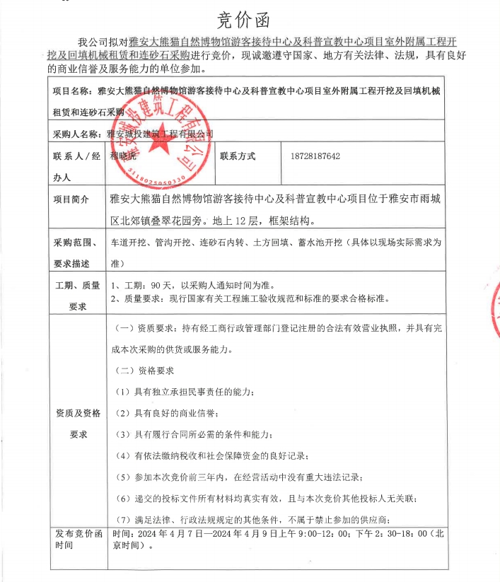 雅安大熊貓自然博物館游客接待中心及科普宣教中心項目室外附屬工程開挖及回填機械租賃和連砂石采購競價公告