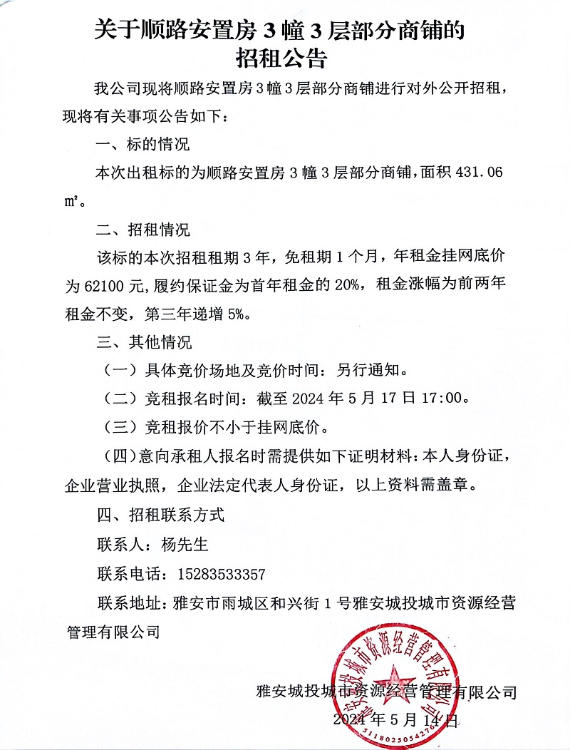 關于順路安置房3幢3層部門商鋪的招租公告