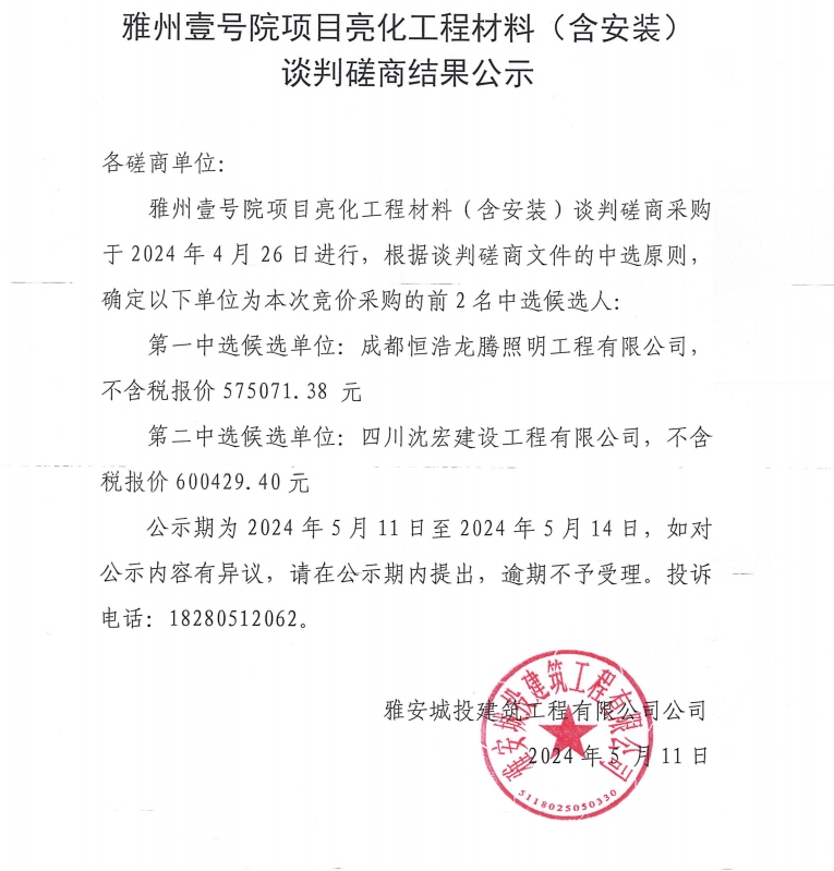 雅州壹號院項(xiàng)目亮化工程材料(含安裝)談判磋商結(jié)果公示