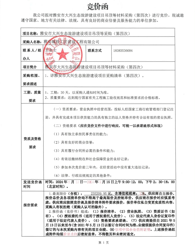 雅安市大興生態(tài)旅游建設(shè)項(xiàng)目吊頂?shù)炔牧喜少?gòu)(第四次)競(jìng)價(jià)文件
