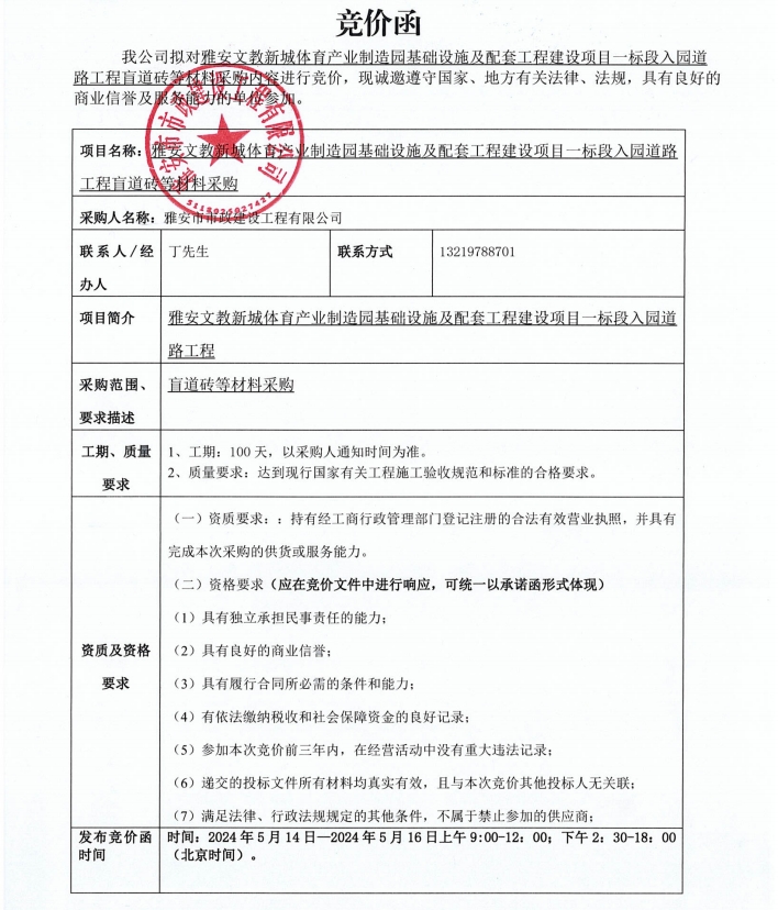 雅安文教新城體育產(chǎn)業(yè)制造園基礎(chǔ)設(shè)施及配套工程建設(shè)項(xiàng)目一標(biāo)段入園道路工程盲道磚等材料采購(gòu)競(jìng)價(jià)公告