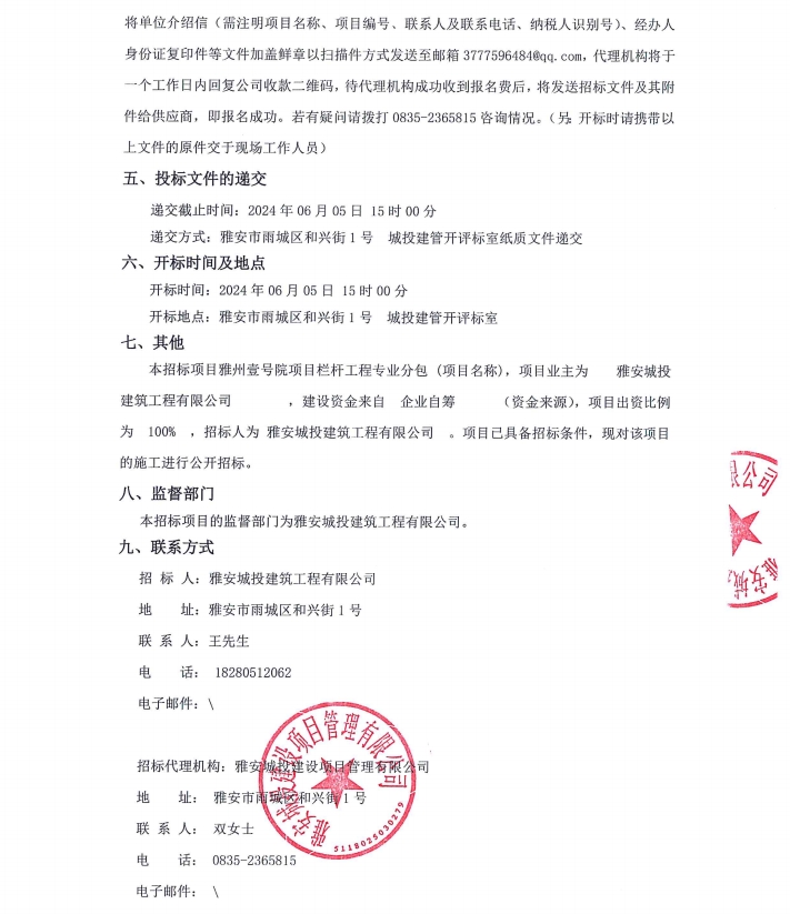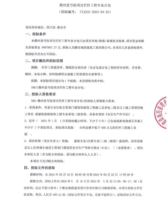 雅州壹號(hào)院項(xiàng)目欄桿工程專(zhuān)業(yè)分包采購(gòu)公告