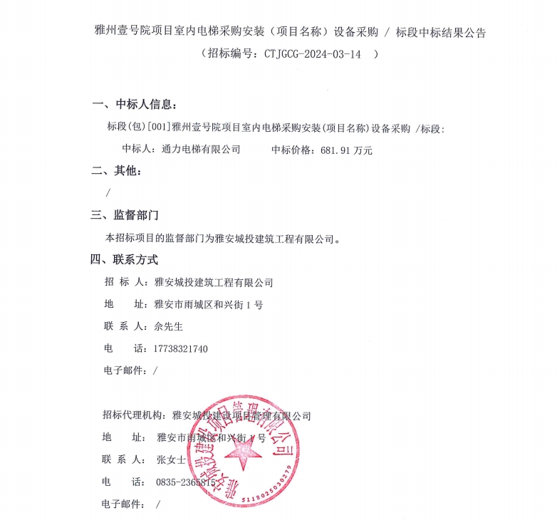 雅州壹號(hào)院項(xiàng)目室內(nèi)電梯采購(gòu)安裝(項(xiàng)目名稱)設(shè)備采購(gòu)/標(biāo)段中標(biāo)結(jié)果公告