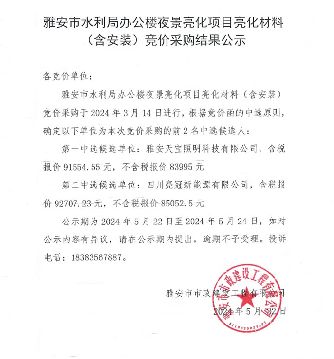 雅安市水利局辦公樓夜景亮化項(xiàng)目亮化材料(含安裝)競(jìng)價(jià)采購(gòu)結(jié)果公示