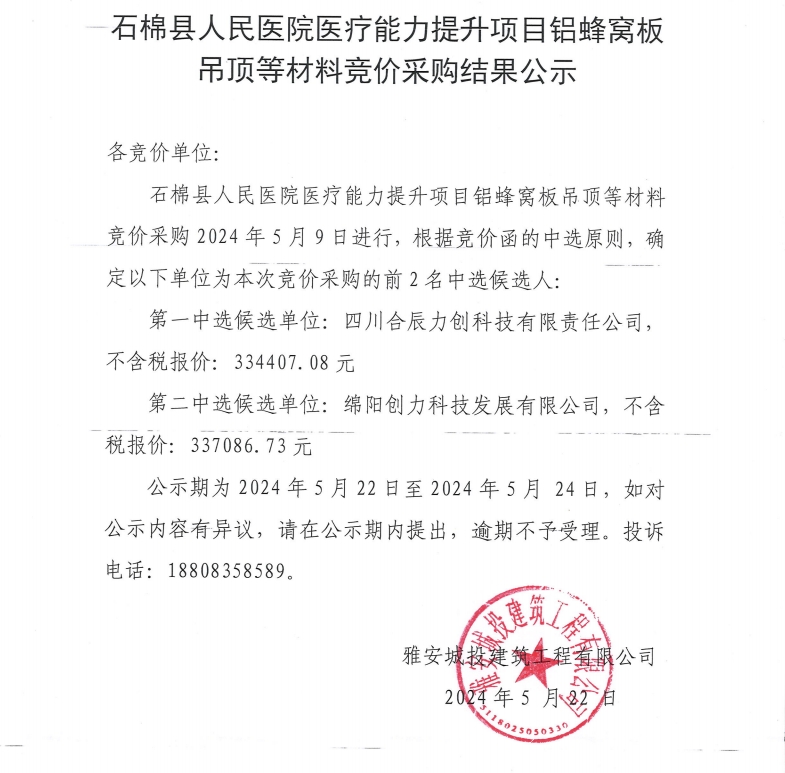 石棉縣人民醫(yī)院醫(yī)療能力提升項(xiàng)目鋁蜂窩板吊頂?shù)炔牧细們r采購結(jié)果公示