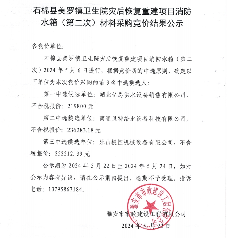 石棉縣美羅鎮(zhèn)衛(wèi)生院災(zāi)后恢復(fù)重建項(xiàng)目消防水箱(第二次)材料采購競價(jià)結(jié)果公示