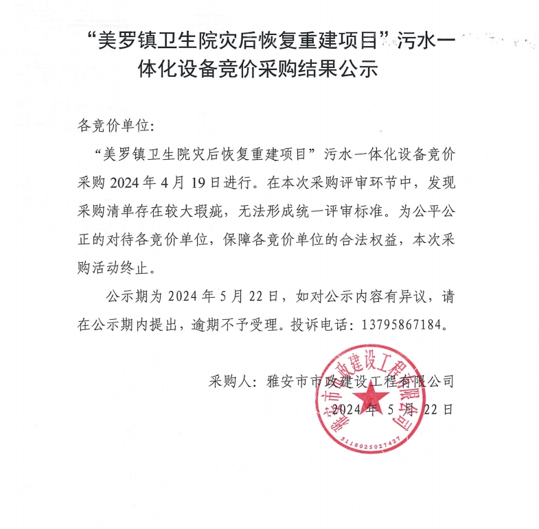美羅鎮(zhèn)衛(wèi)生院災后恢復重建項目污水一體化設備競價采購結果公示
