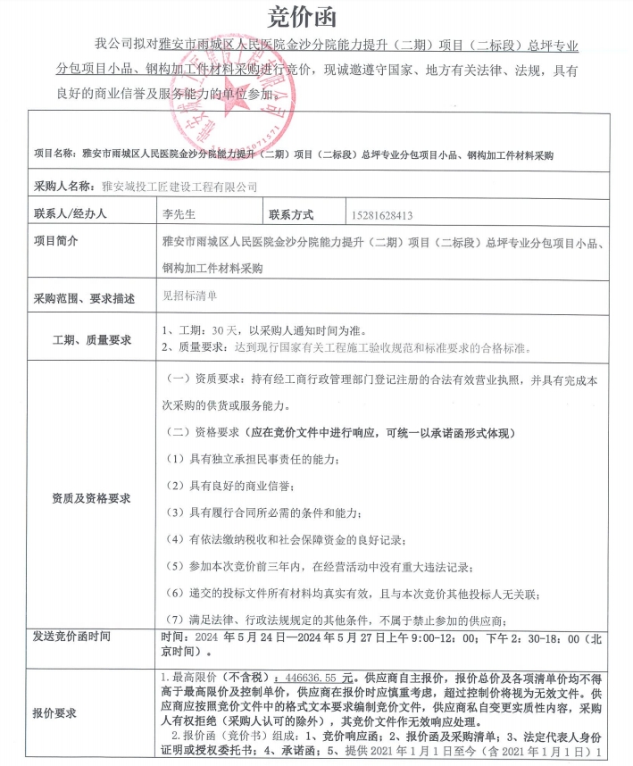 雅安市雨城區(qū)人民醫(yī)院金沙分院能力提升(二期)項目(二標(biāo)段)總坪專業(yè)分包項目小品、鋼構(gòu)加工件材料采購競價函
