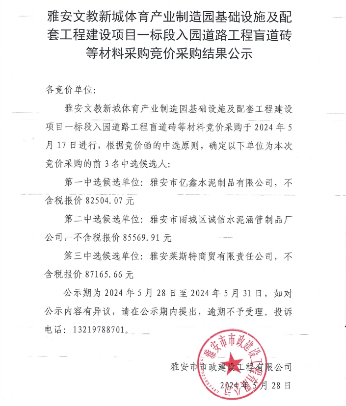 雅安文教新城體育產(chǎn)業(yè)制造園基礎設施及配套工程建設項目一標段入園道路工程盲道磚等材料采購競價采購結果公示