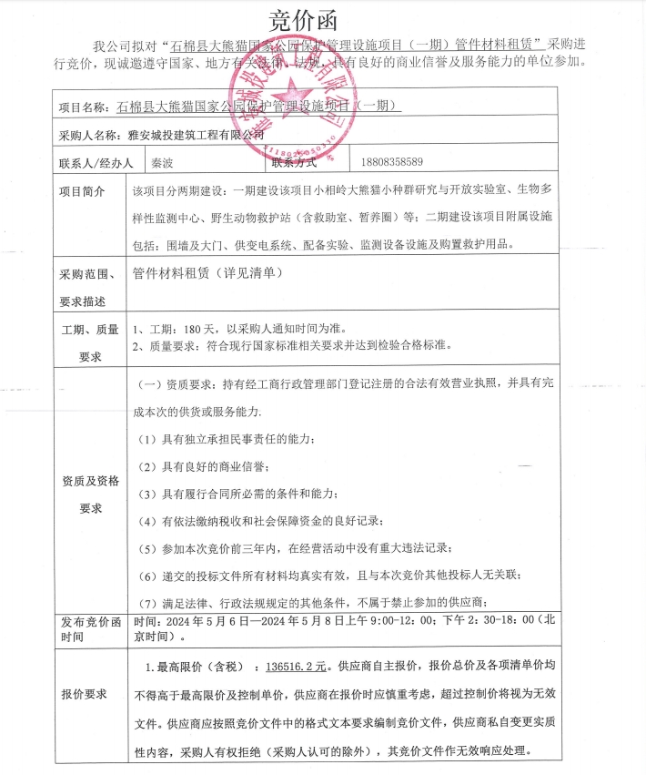 石棉縣大熊貓國(guó)家公園保護(hù)管理設(shè)施項(xiàng)目(一期)管件材料租賃采購(gòu)競(jìng)價(jià)公告