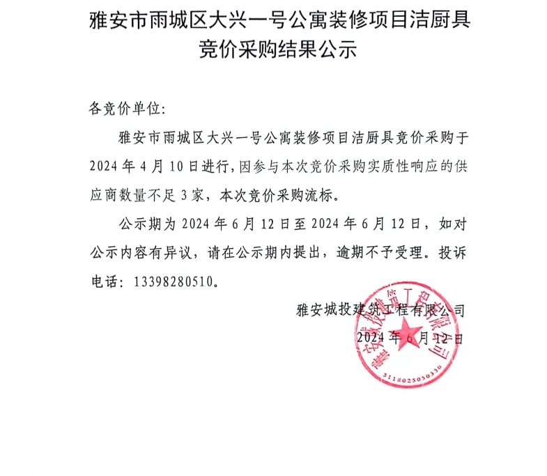 雅安市雨城區(qū)大興壹號公寓裝修項目潔廚具競價采購結果公示