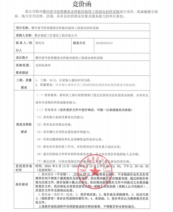 雅州壹號院售樓部及樣板間裝飾工程弱電材料采購競價公告