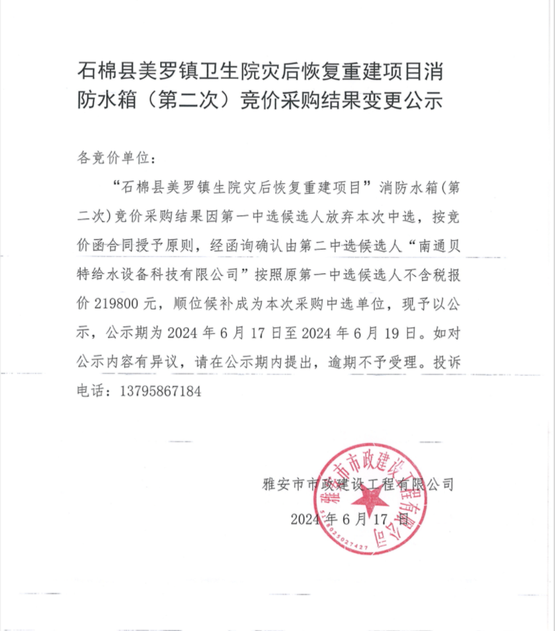 石棉縣美羅鎮(zhèn)衛(wèi)生院災(zāi)后恢復(fù)重建項目消防水箱(第二次)競價采購結(jié)果變更公示