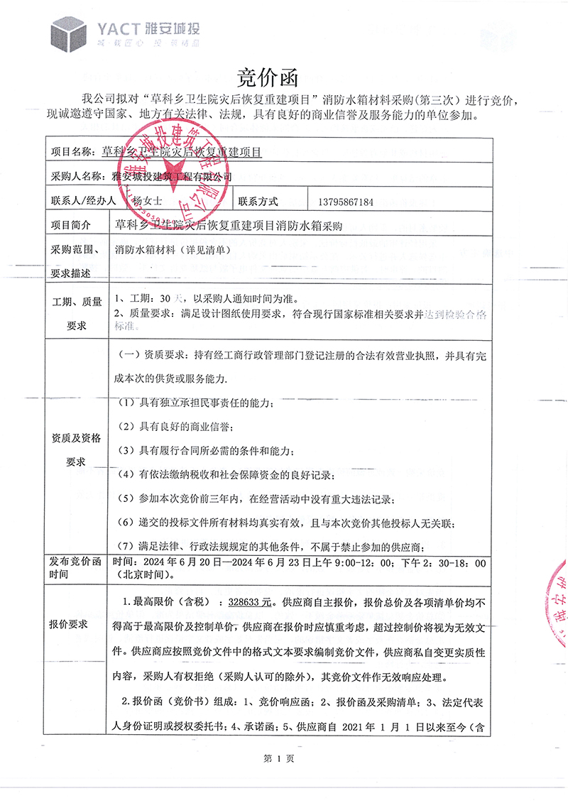 草科鄉(xiāng)衛(wèi)生院災(zāi)后恢復(fù)重建項目消防水箱(第三次)采購競價函
