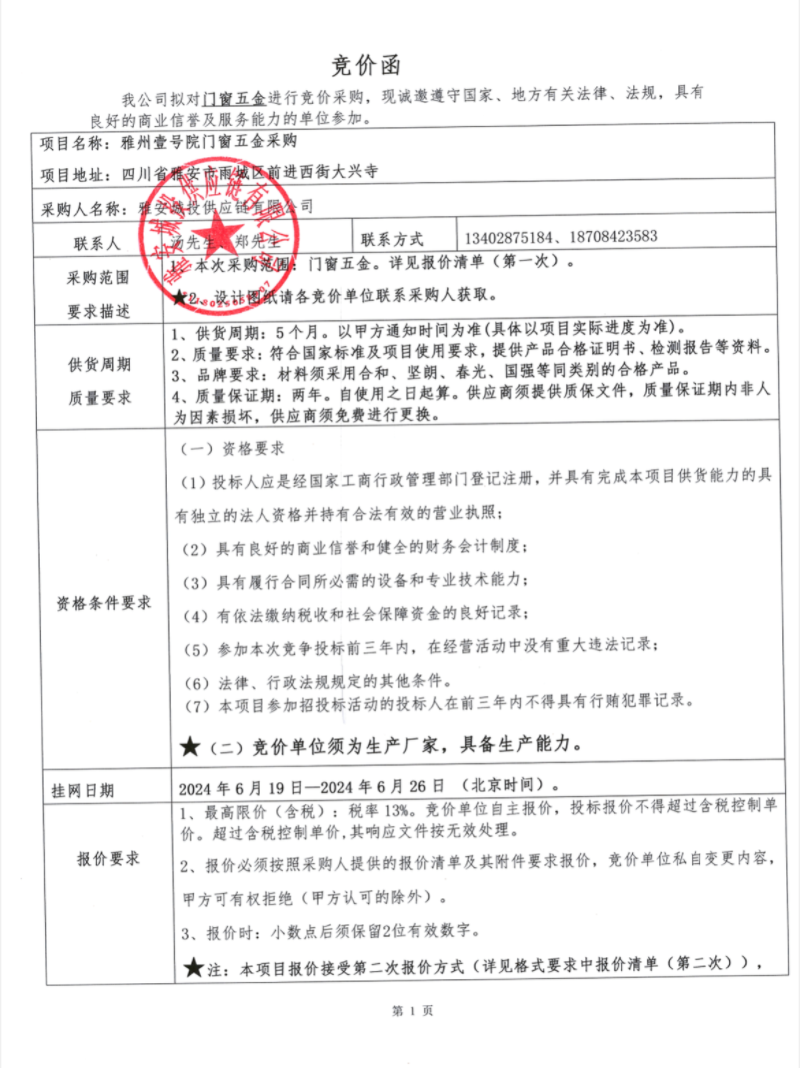競價(jià)函--雅州壹號院門窗五金采購