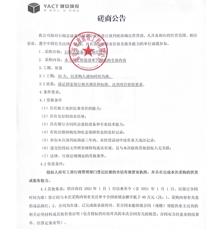 石棉縣儲備項目路燈采購談判磋商公告
