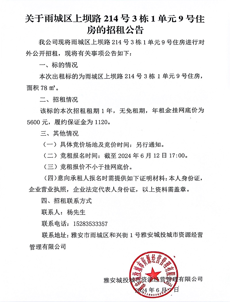 關(guān)于雨城區(qū)上壩路214號(hào)3棟1單元9號(hào)住房的招租公告
