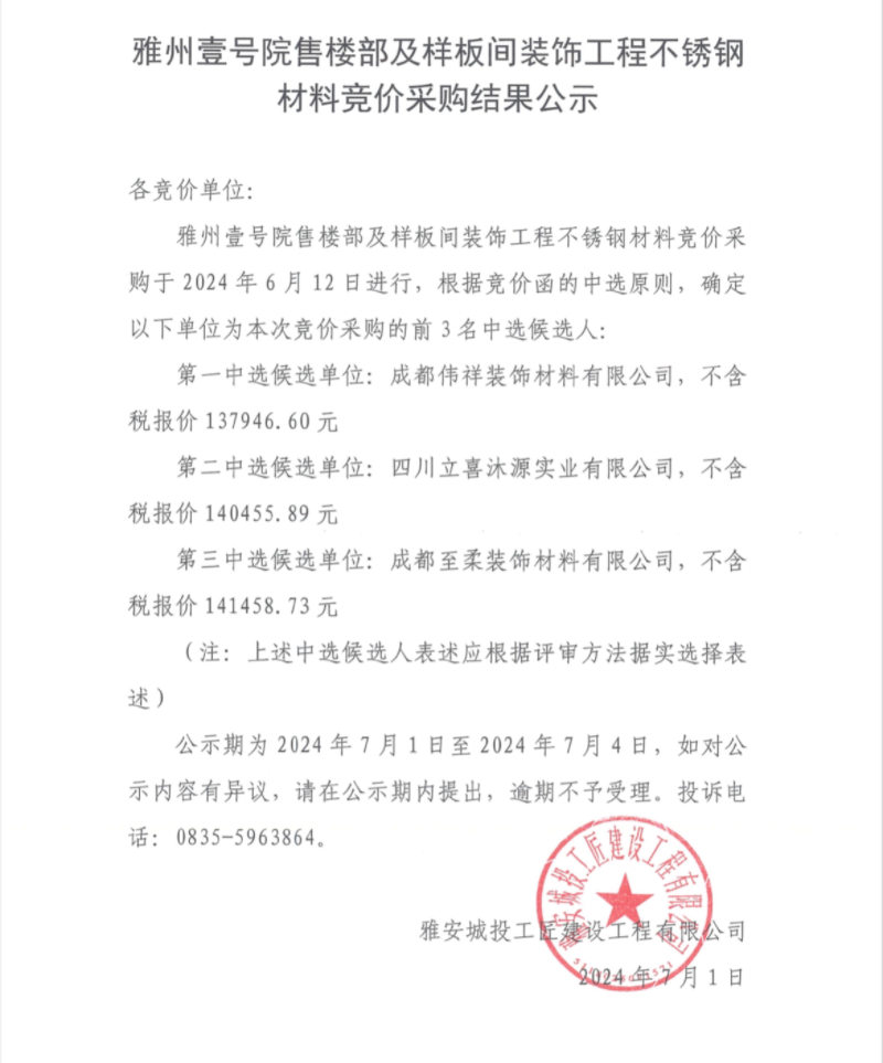 雅州壹號(hào)院售樓部及樣板間裝飾工程不銹鋼材料競(jìng)價(jià)采購結(jié)果公示