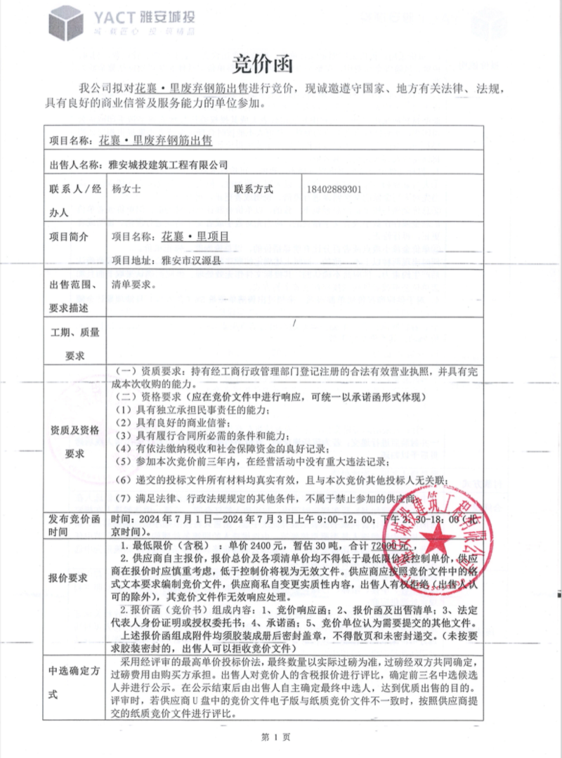 花襄·里廢棄鋼筋出售競價公告