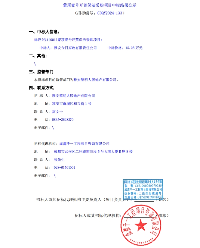 蒙頂壹號開荒保潔采購項目中標結(jié)果公示