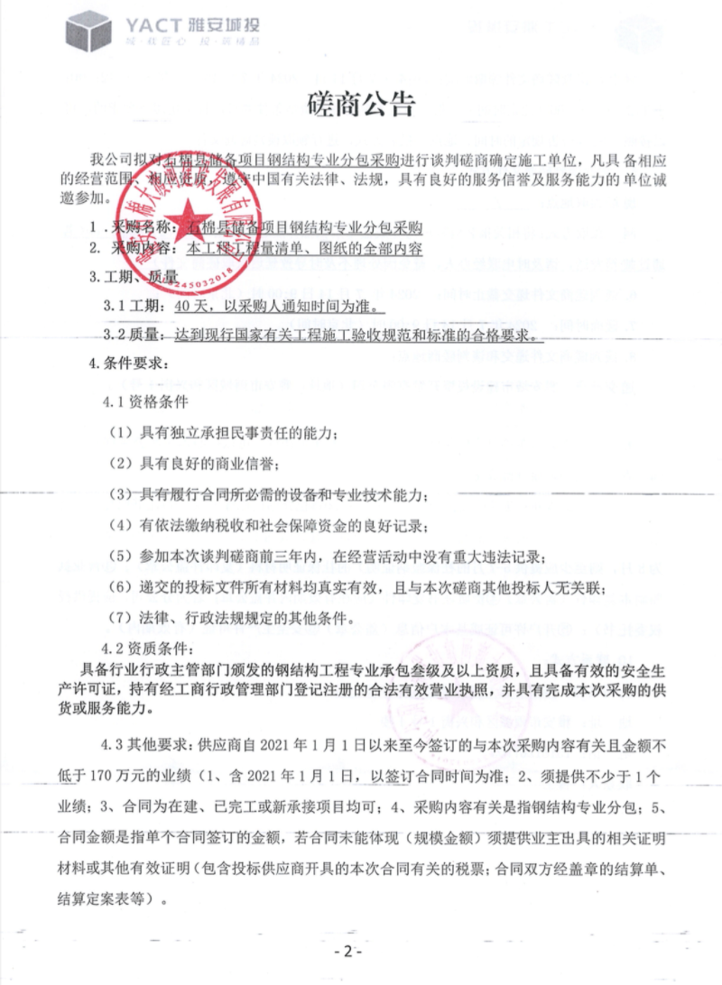 石棉縣儲(chǔ)備項(xiàng)目鋼結(jié)構(gòu)專業(yè)分包采購談判磋商公告