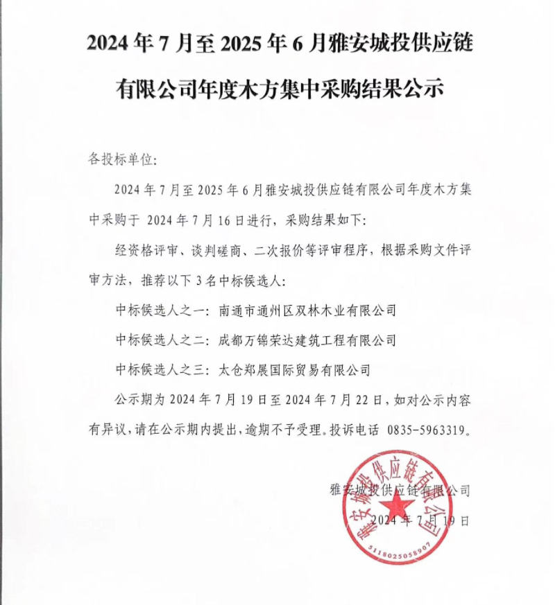 2024年7月至2025年6月雅安城投供應鏈有限公司年度木方集中采購結果公示