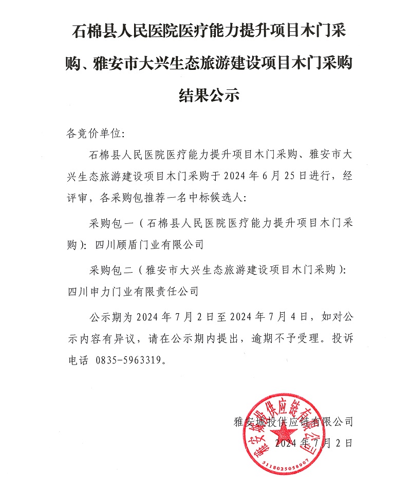 石棉縣人民醫(yī)院醫(yī)療能力提升項(xiàng)目木門采購(gòu)、雅安市大興生態(tài)旅游建設(shè)項(xiàng)目木門采購(gòu)結(jié)果公示