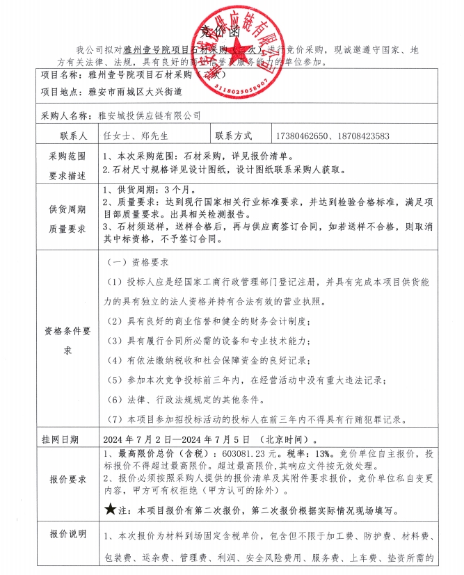雅州壹號院項(xiàng)目石材采購(二次)競價公告