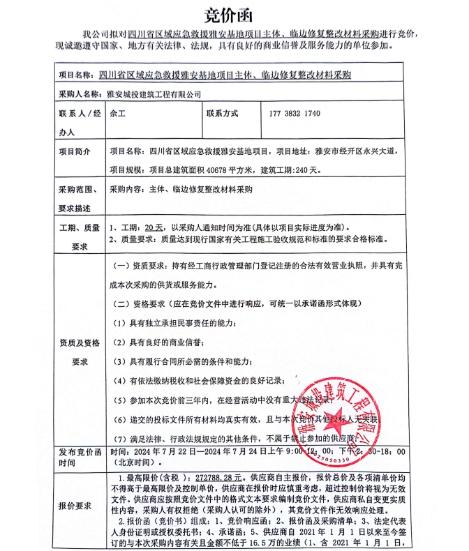 四川省區(qū)域應急救援雅安基地項目主體、臨邊修復整改材料采購競價公告