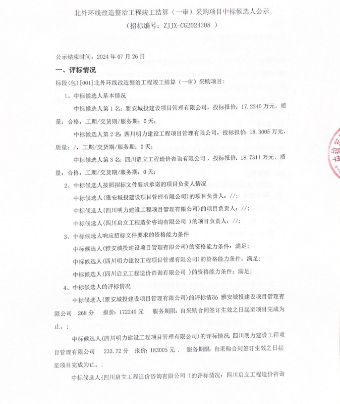 北外環(huán)線改造整治工程竣工結(jié)算(一審)采購項目中標(biāo)候選人公示