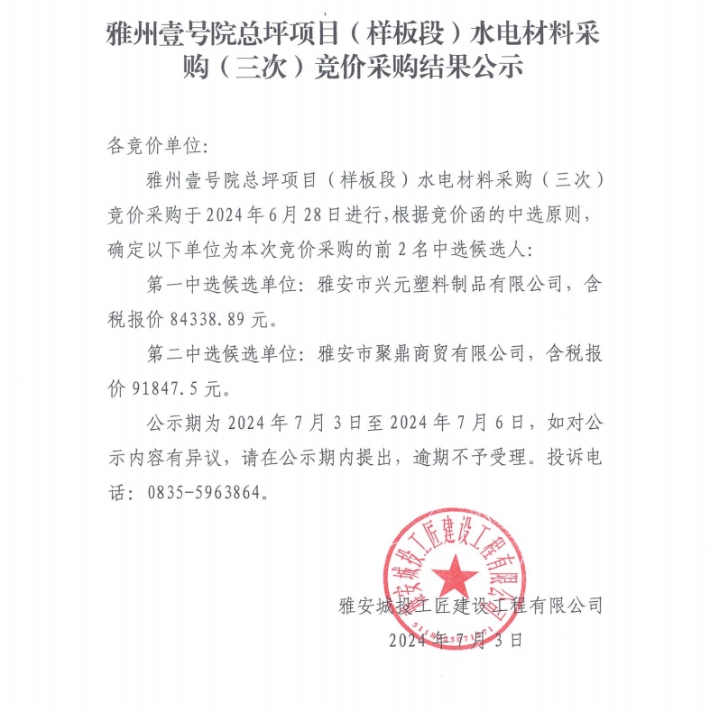 雅州壹號院總坪項(xiàng)目(樣板段)水電材料采購(三次)競價(jià)采購結(jié)果公示