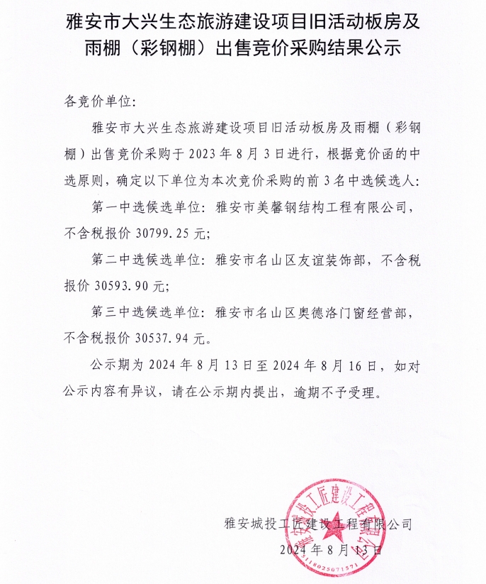 雅安市大興生態(tài)旅游建設項目舊活動板房及雨棚(彩鋼棚)出售競價采購結(jié)果公示