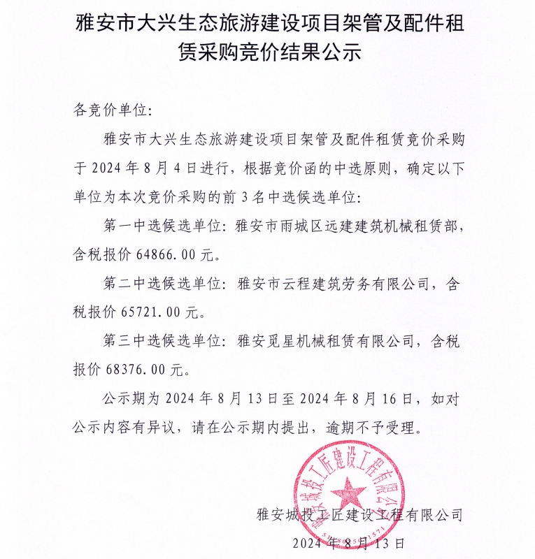 雅安市大興生態(tài)旅游建設(shè)項目架管及配件租賃采購競價結(jié)果公示