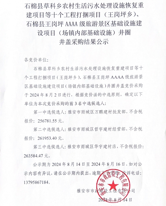 石棉縣草科鄉(xiāng)農(nóng)村生活污水處理設(shè)施恢復(fù)重建項(xiàng)目等十個(gè)工程打捆項(xiàng)目(王崗坪鄉(xiāng))、石棉縣王崗坪AAAA級(jí)旅游景區(qū)基礎(chǔ)設(shè)施建設(shè)項(xiàng)目(場(chǎng)鎮(zhèn)內(nèi)部基礎(chǔ)設(shè)施)井圈井蓋采購(gòu)結(jié)果公示