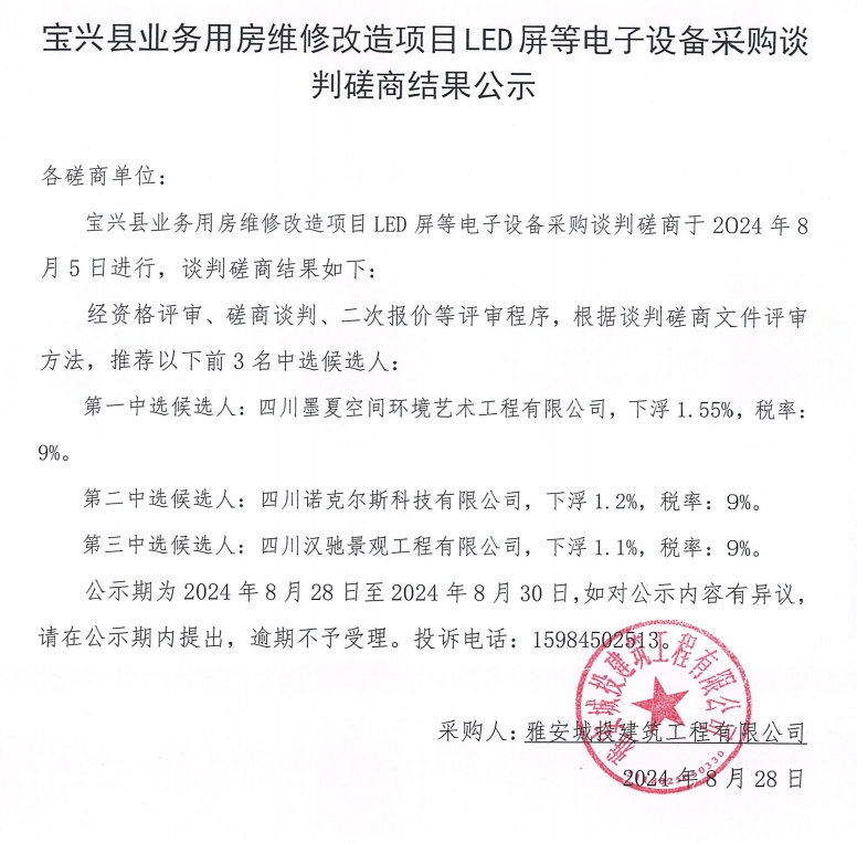 寶興縣業(yè)務用房維修改造項目LED屏等電子設備采購磋商結(jié)果公示