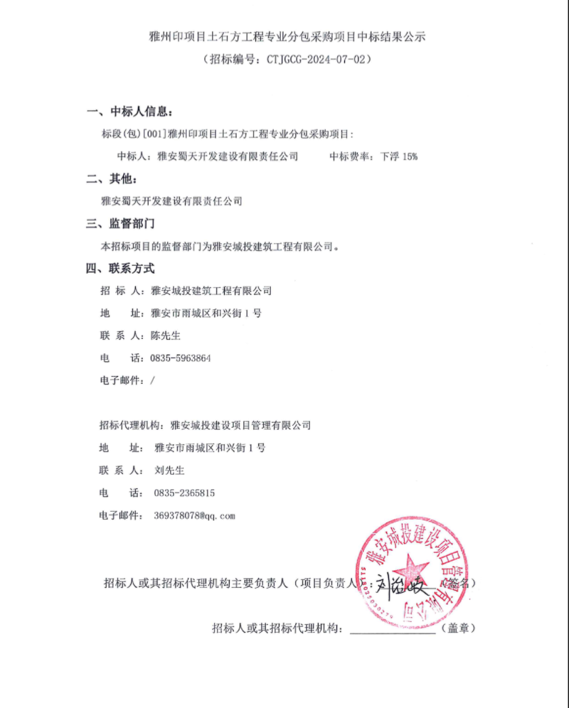 雅州印項(xiàng)目土石方工程專業(yè)分包采購項(xiàng)目中標(biāo)結(jié)果公示