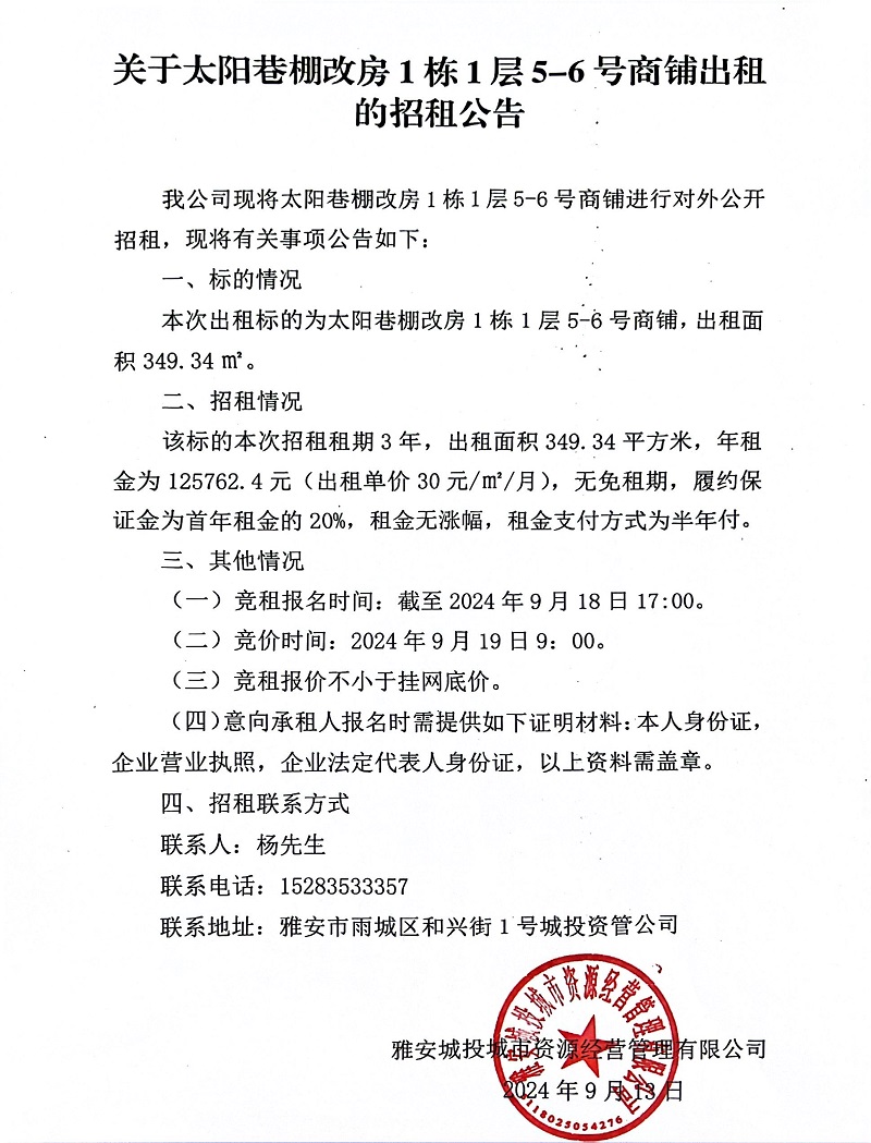 關于太陽巷棚改房1棟1層5-6號商鋪出租的招租公告