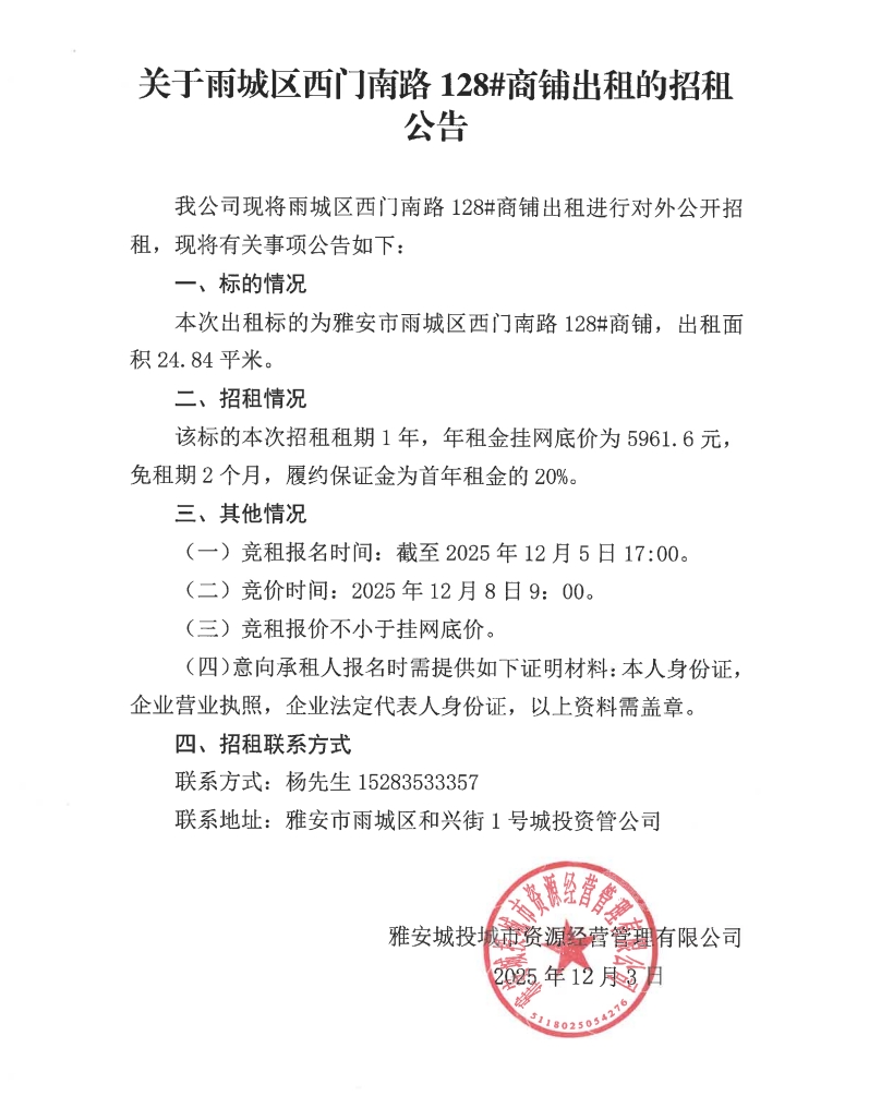 關于雨城區(qū)西門南路128#商鋪出租的招租公告