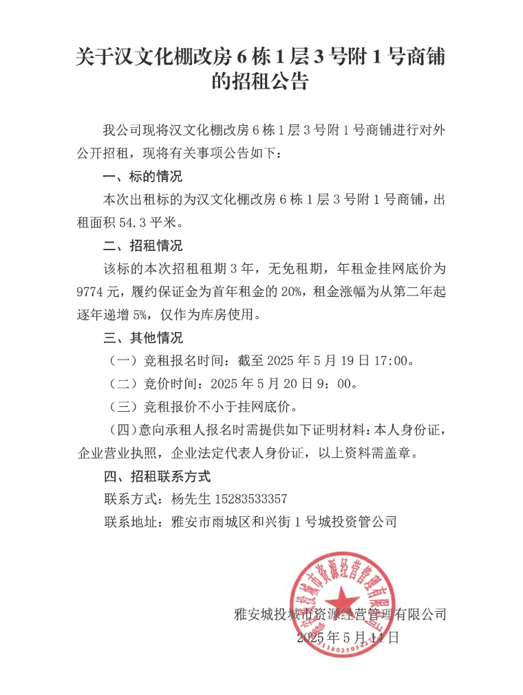 關(guān)于漢文化棚改房6棟1層3號(hào)附1號(hào)商鋪的招租公告
